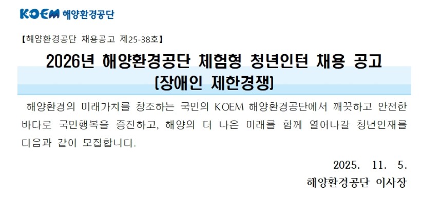 [해양환경공단] 2026년 해양환경공단 체험형 청년인턴(장애인 제한경쟁) 채용공고